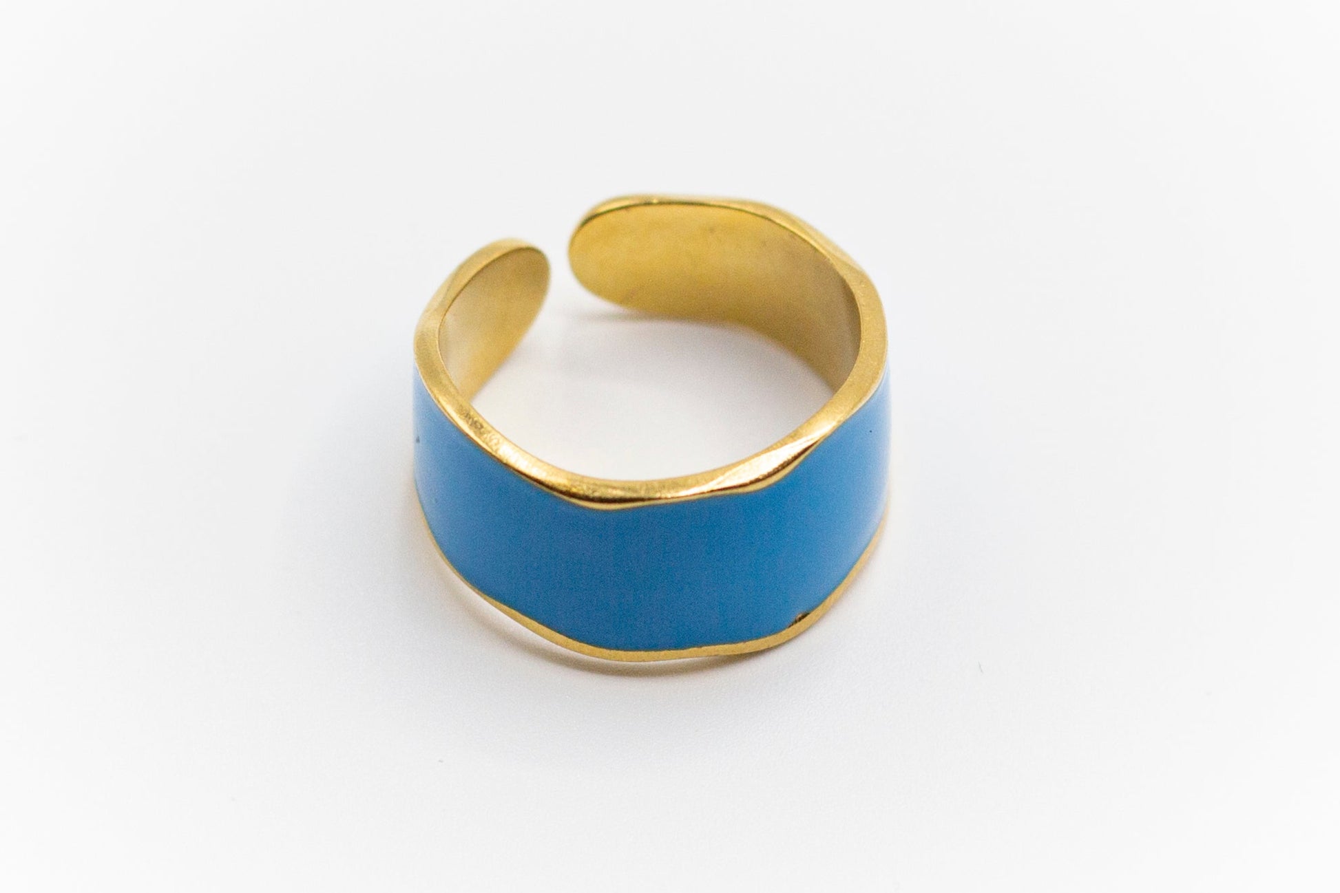 Verstellbarer goldener Edelstahlring mit blauem Acryl.