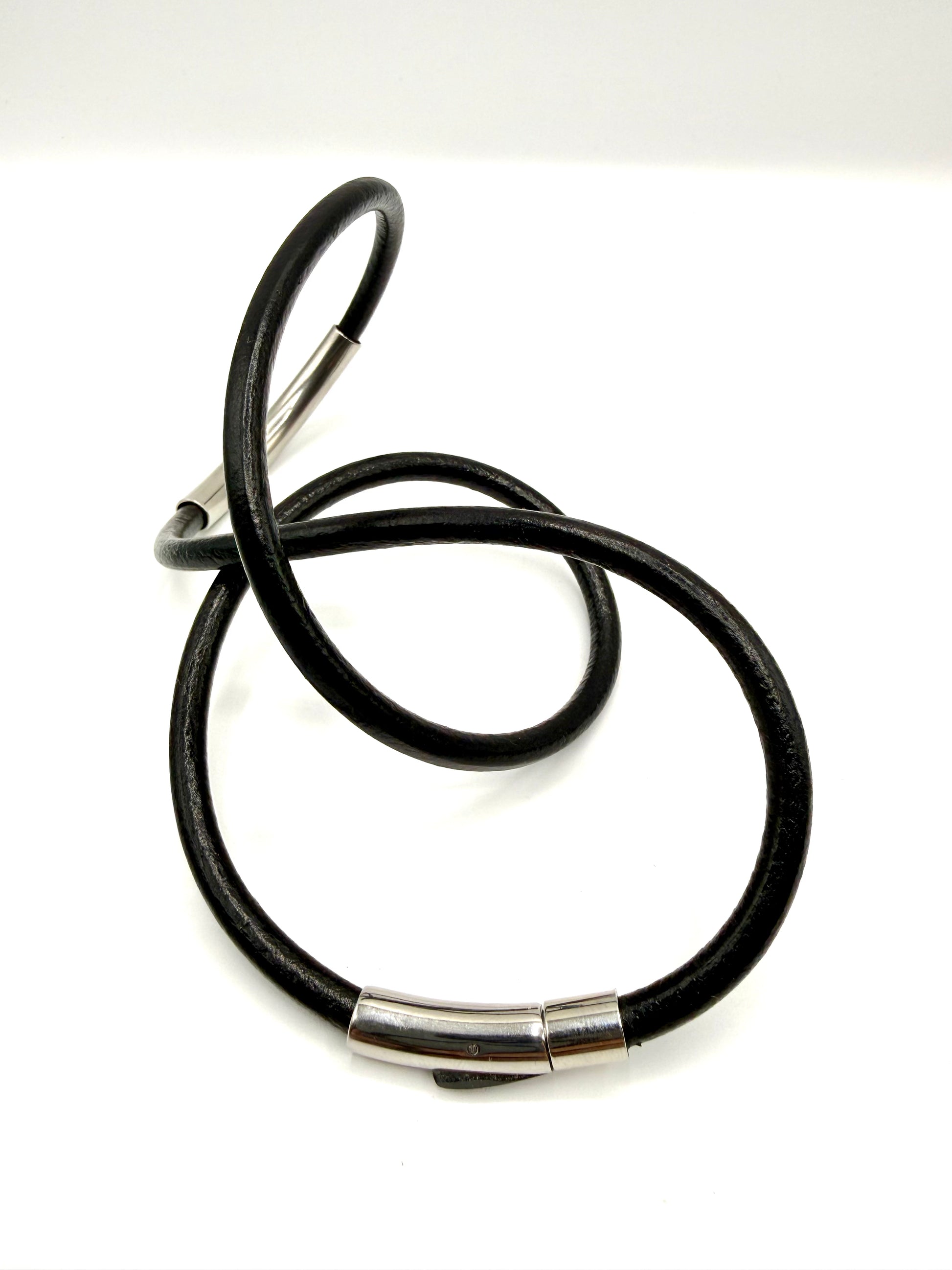 Pieza versátil de cuero negro genuino combinado con acero inoxidable pulido, diseñada para adaptarse a tu estilo personal. Úsala como pulsera elegante o reconfígurala como collar sofisticado según el momento. El acero inoxidable resiste la oxidación y el desgaste diario, mientras que el cuero envejece naturalmente, ganando carácter con el tiempo. Perfecta para quien busca una accesorio premium que trascienda las tendencias.