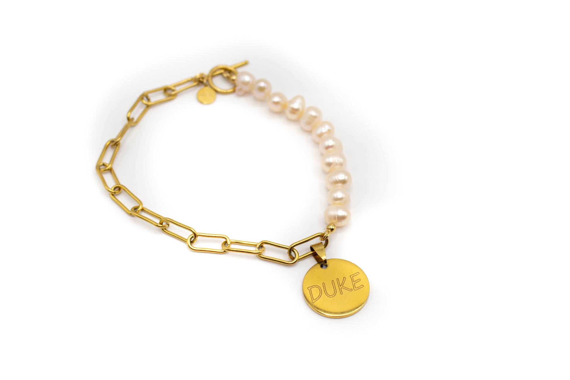 collar para mascota mitad cadena de acero inoxidable color oro y mitad de perlas naturales de cultivo, personalizado con el nombre de tu mascota y los datos que desee