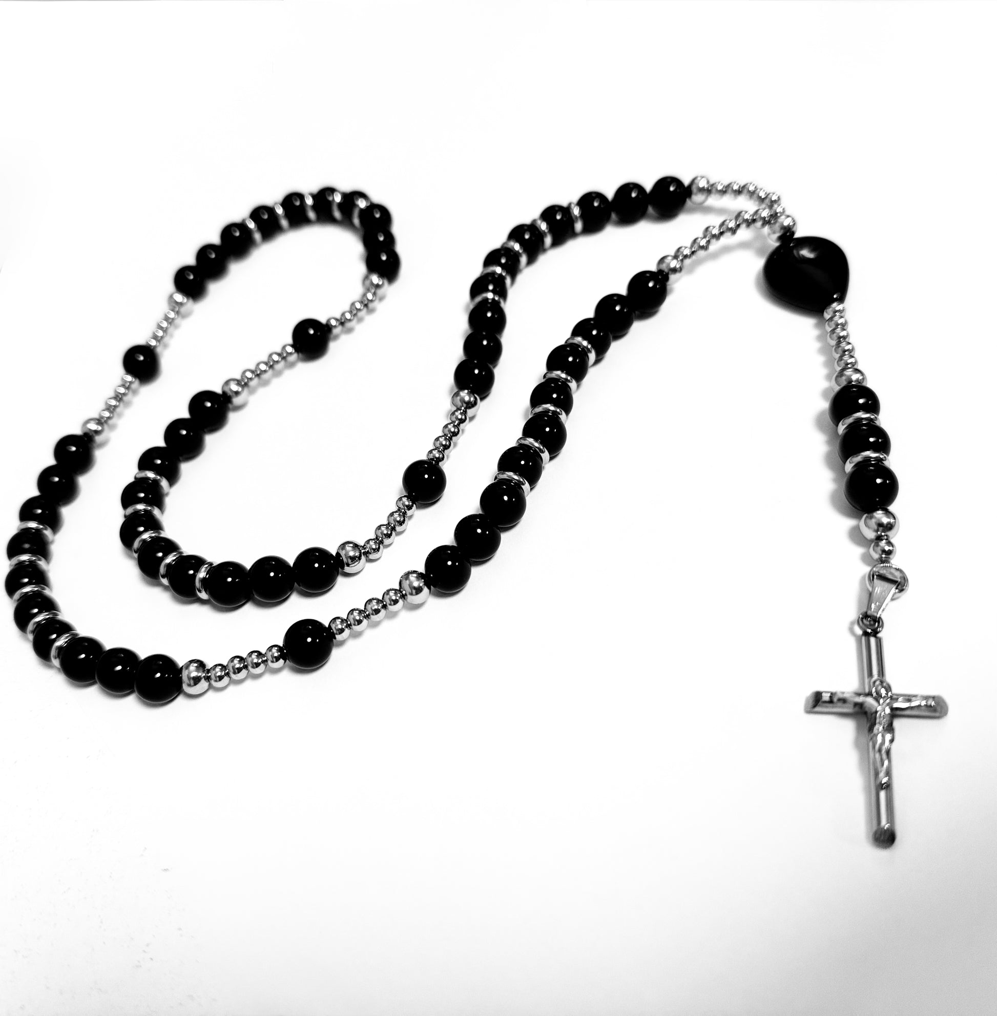 Rosario de acero inoxidable y piedras naturales obsidiana, turmalina y ónix